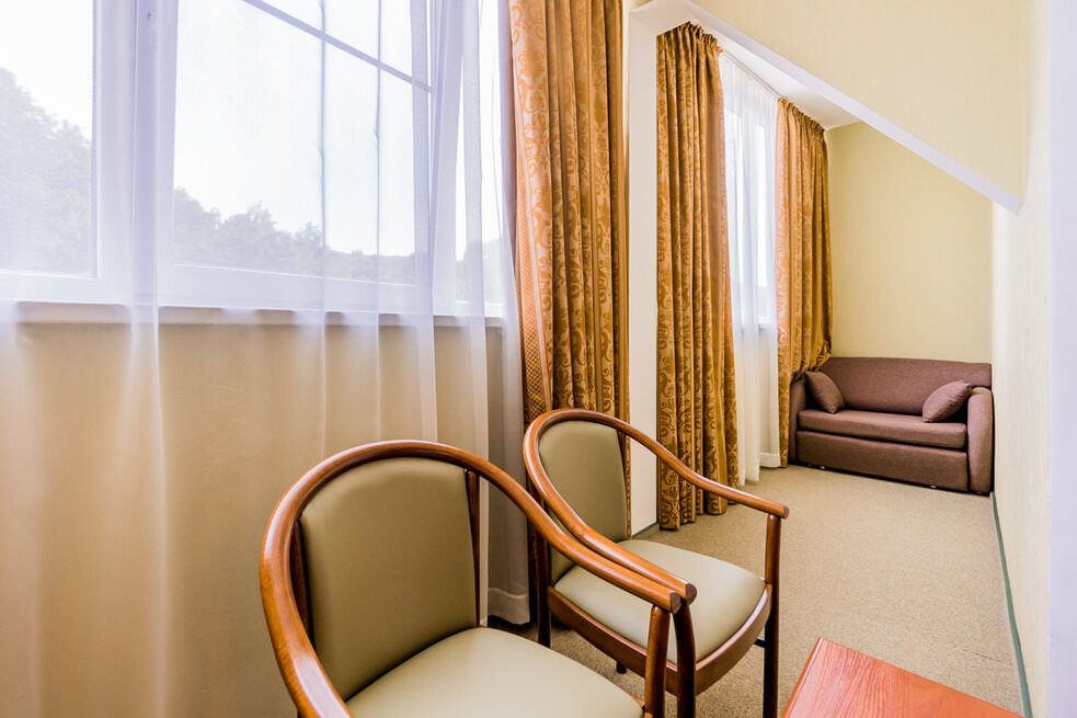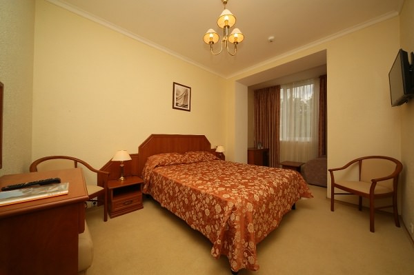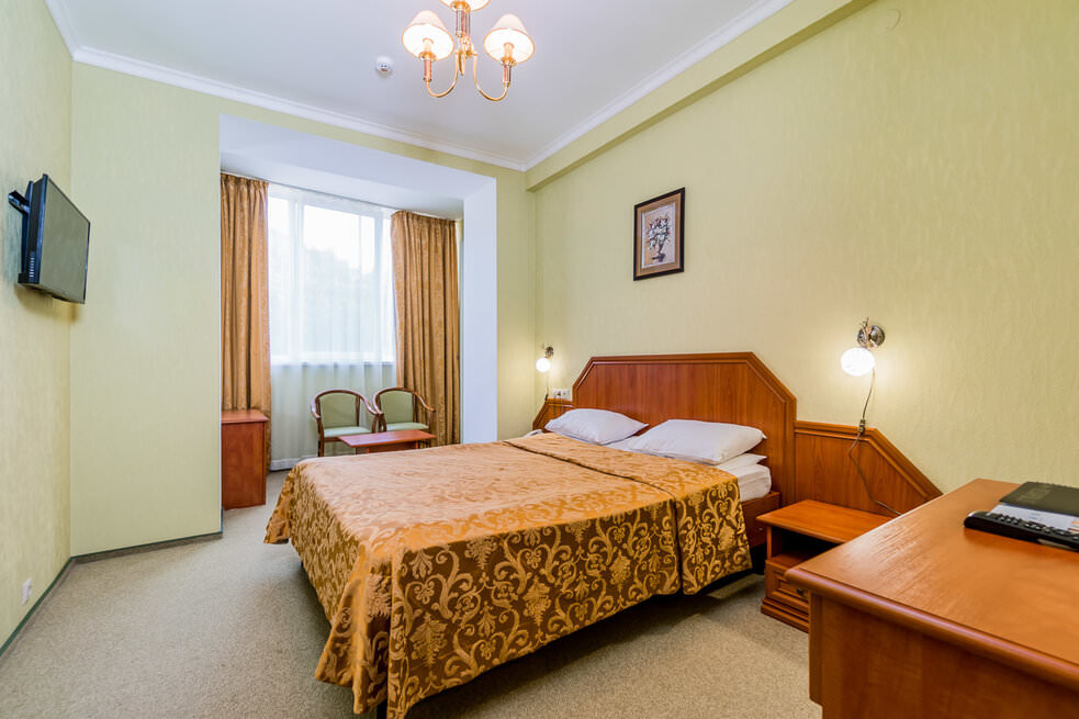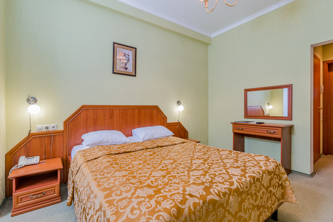 Площадь номера - 25 кв.м. 2 осн. места. 1 доп. место. Мебель: вешалка, зеркало, кровать двуспальная, прикроватные тумбочки, стол, столик журнальный, стулья, шкаф. Оборудование: набор посуды, система общего кондиционирования, телевизор, холодильник. Санузел: с душевой кабиной, тапочки, туалетные принадлежности, фен, халат. Сервис: Wi-Fi бесплатно, мини-бар, смена полотенец (1 раз в день), смена постельного белья (1 раз в 3 дня), уборка номера (ежедневно).