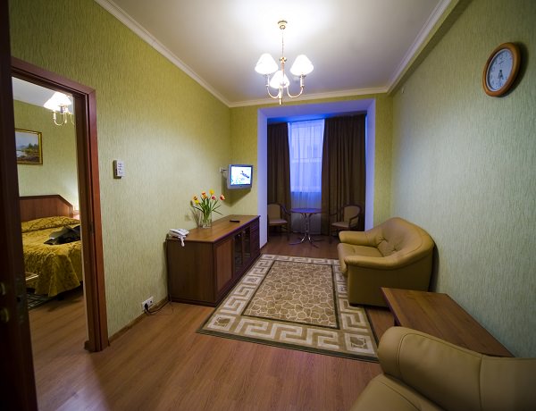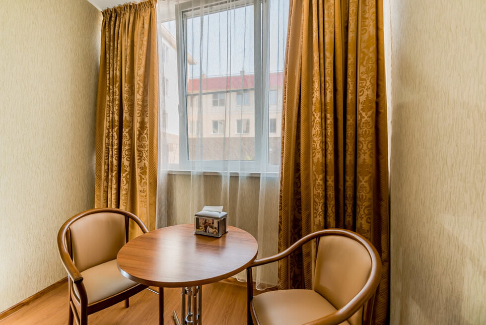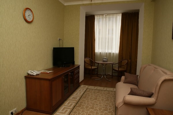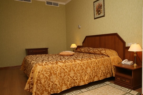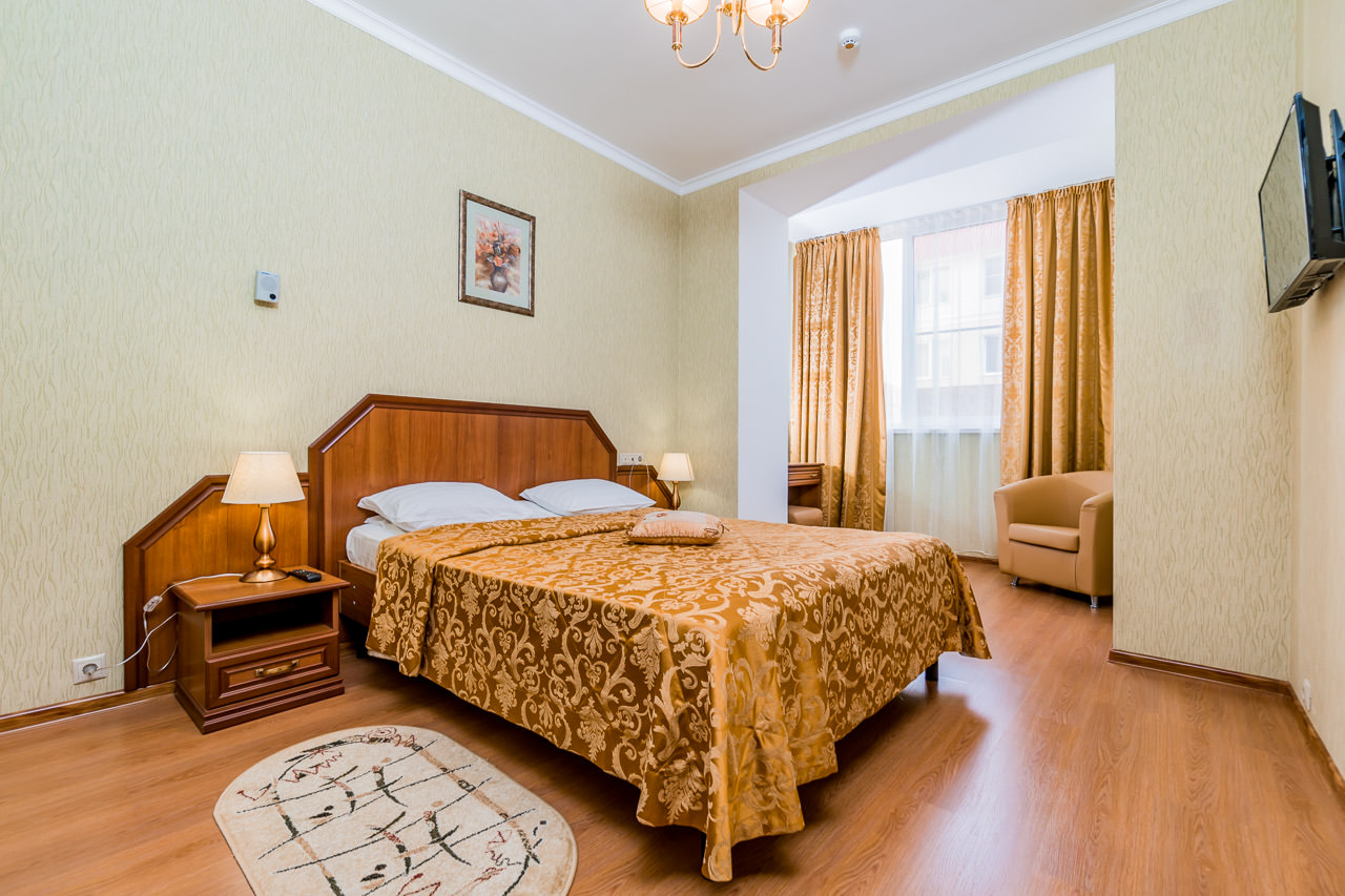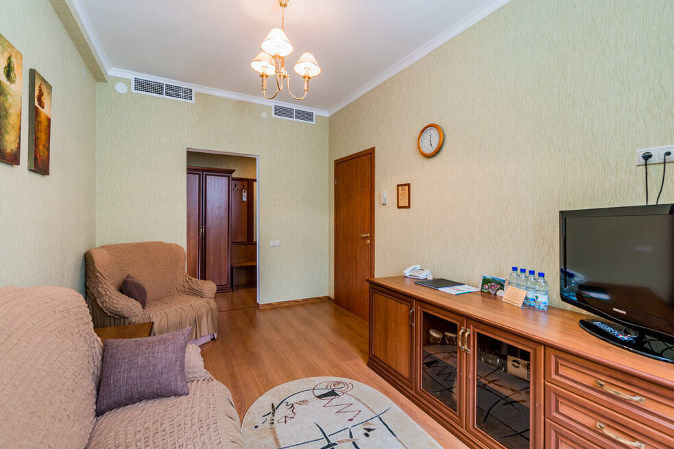 Площадь номера - 40 кв.м. 2 осн. места. 1 доп. место. Мебель: вешалка, зеркало, кресло, кровать двуспальная, прикроватные тумбочки, столик журнальный, стулья, шкаф. Оборудование: набор посуды, система общего кондиционирования, телевизор, холодильник. Санузел: с душевой кабиной, тапочки, туалетные принадлежности, фен. Сервис: Wi-Fi бесплатно, мини-бар, смена полотенец (1 раз в день), смена постельного белья (1 раз в 3 дня), уборка номера (ежедневно).